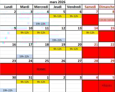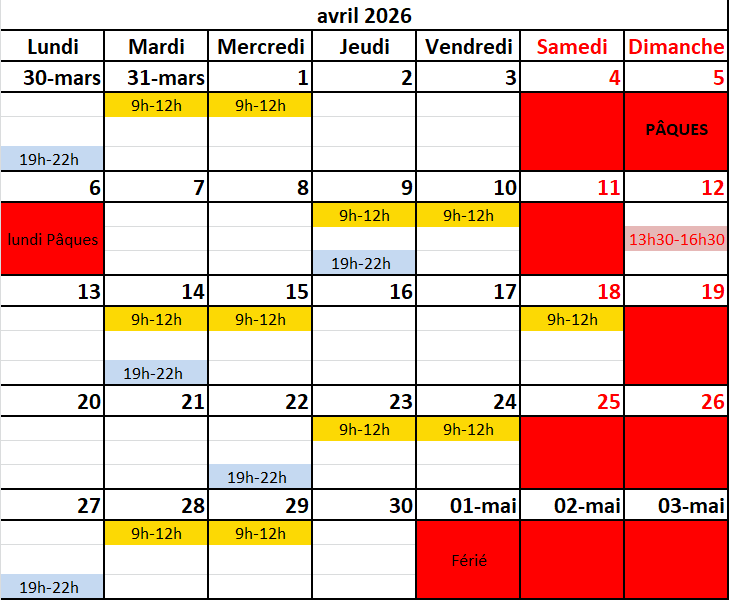 L'atelier est fermé durant la 1ère semaine des congés de printemps.